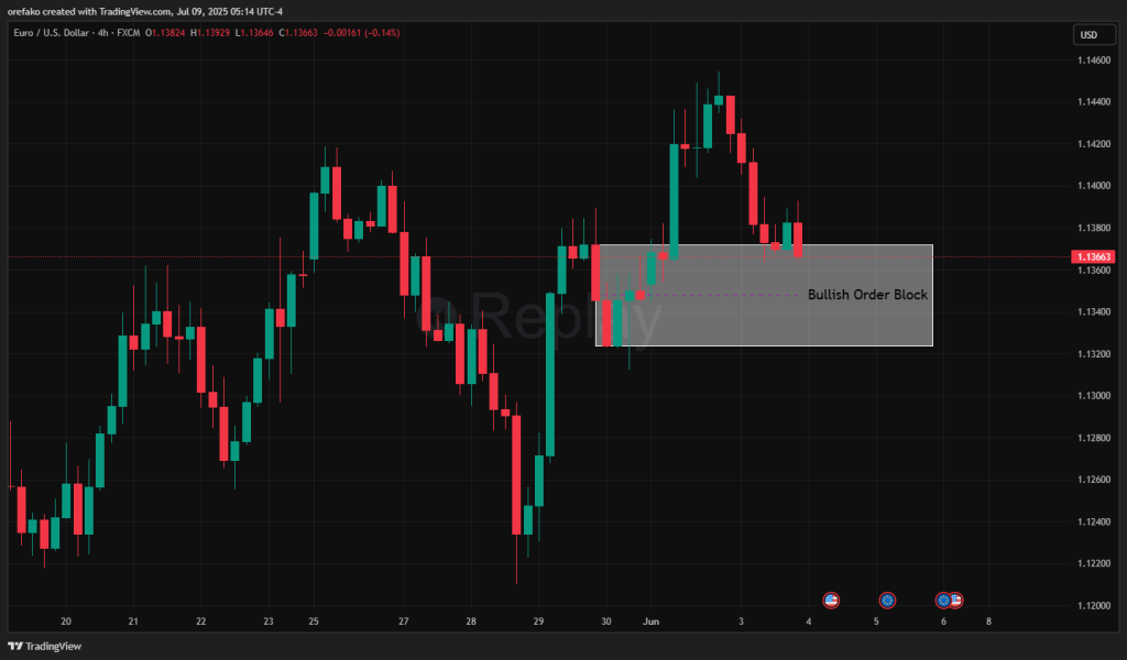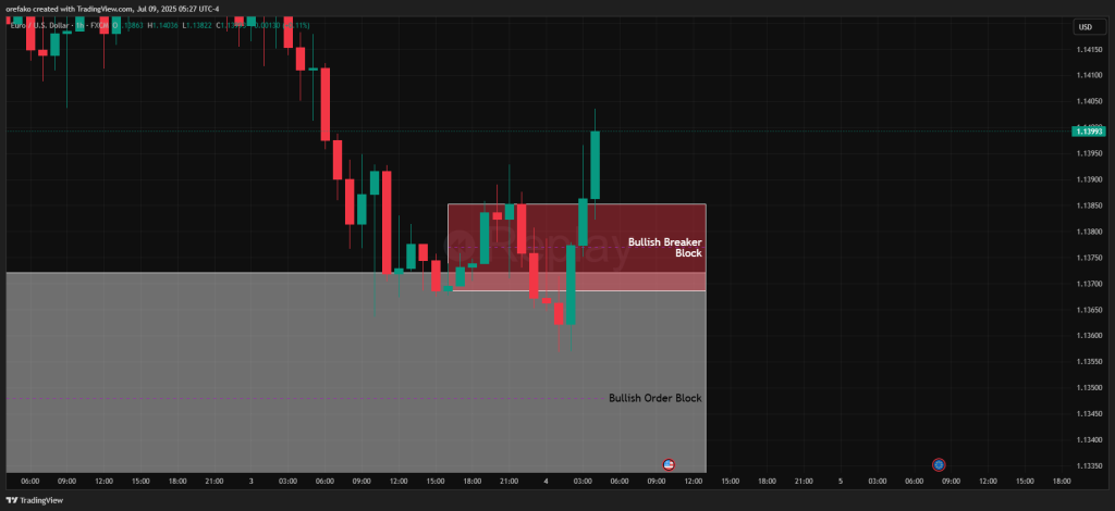 Next, we examine the 1-hour chart to confirm that the price has returned to bullish conditions following the retracement. And there, you’ll also see that the bearish order block, which formed when the price entered the 4-hour bullish order block, has been flipped. And when an order block is flipped, it becomes a breaker block. This is exactly what you want to see to confirm the continuation of the major bullish trend.