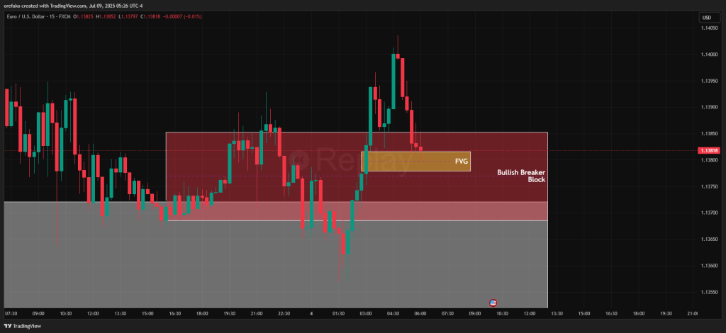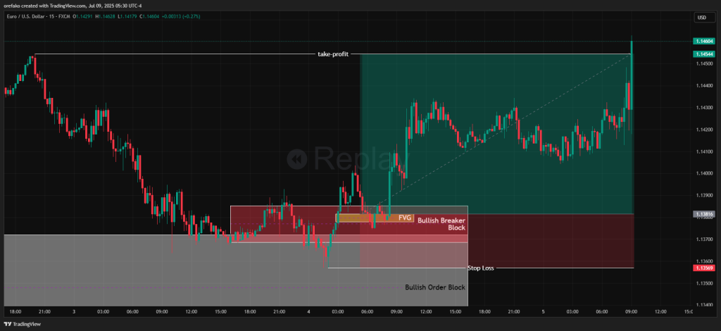 Finally, we drop to the 15-minute timeframe to catch an entry. The best case scenario is to wait for the price to return to your breaker block. If there’s an FVG or 15-minute order block in this 1-hour breaker block, it’s a good entry zone for you.