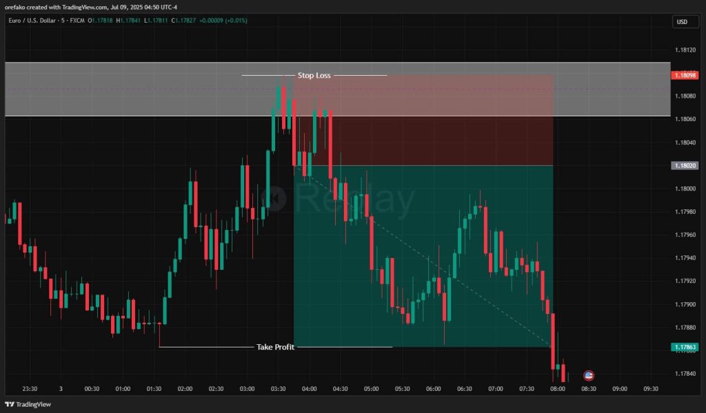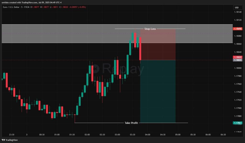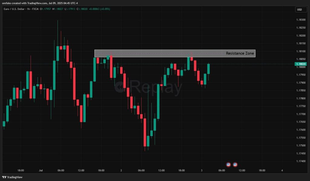 Let’s use the EURUSD chart on the hourly and 5-minute timeframes as our example. Notice that we approach a resistance zone where the price has clearly struggled to break through.